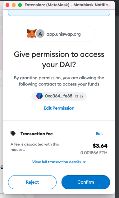 before we can use the DAI tokens, we need to give the app the permission to access the DAI on your behalf \(\to\) you need to sign this as a transaction with your wallet