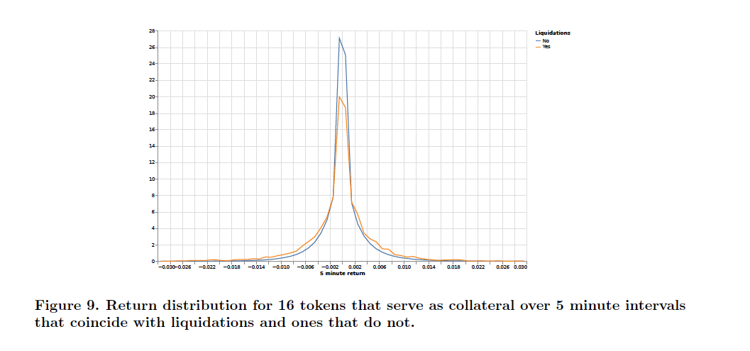 Figure 9: Return distribution for 16 tokens that serve as collateral over 5 minute intervals that coincide with liquidations and ones that do not.