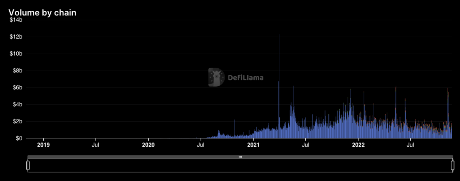 Observation 1: UniSwap and Binance volumes are not far apart in the sample horizon (although Binance \(\approx 5 \times\) UniSwap