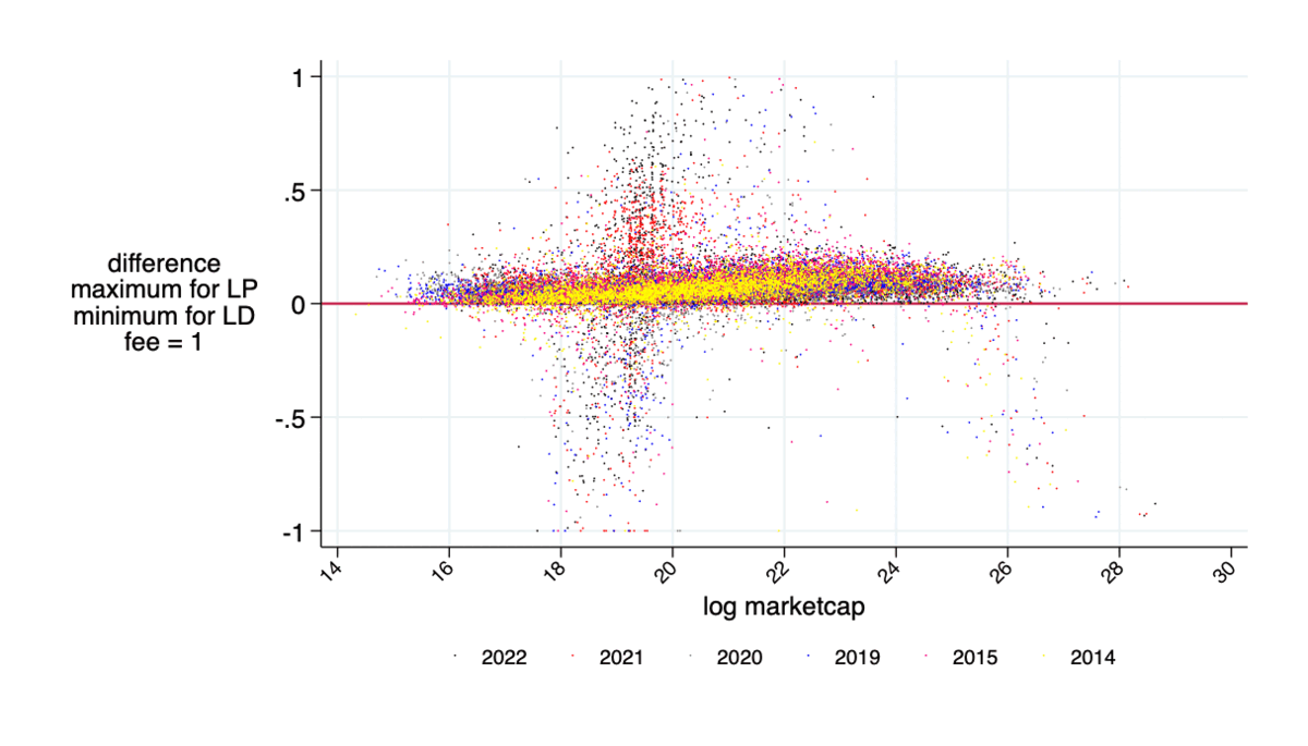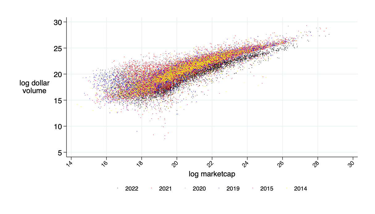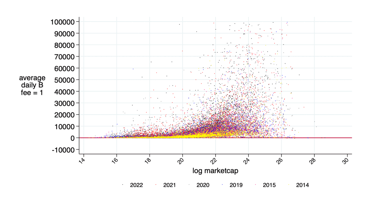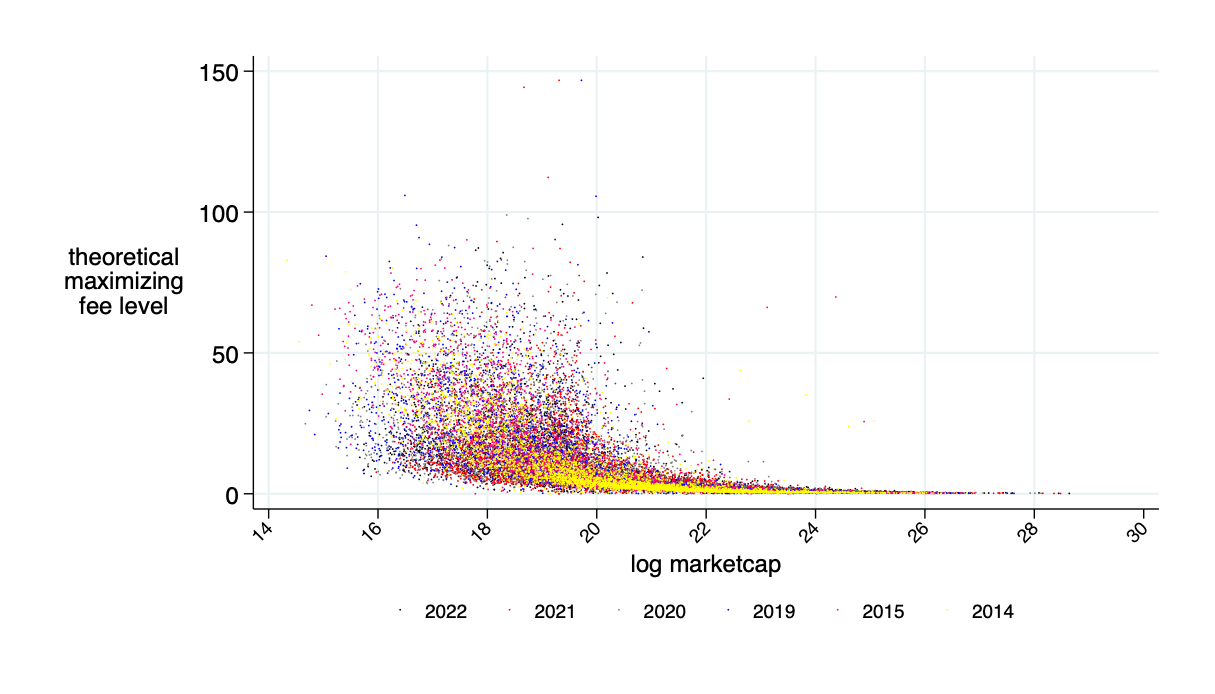 Hasbrouck, Rivera, and Saleh (2022): higher fee \(\Rightarrow\) higher volume