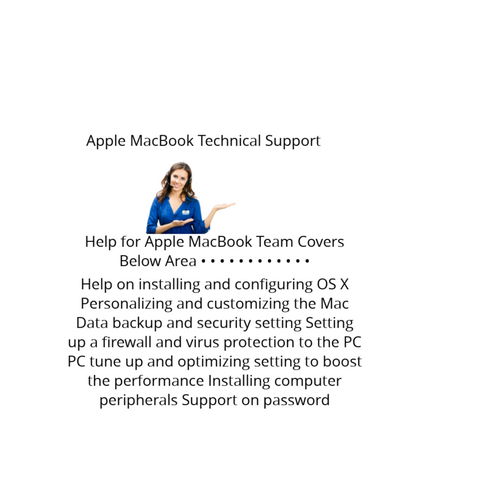Help for Apple MacBook Team Covers Below Area • • • • • • • • • • • • Help on installing and configuring OS X Personalizing and customizing the Mac Data backup and security setting Setting up a firewall and virus protection to the PC PC tune up and optimizing setting to boost the performance Installing computer peripherals Support on password recovery of applications Social networking integration support Adaptor and Bluetooth setting Connect to the other Apple device Synchronization with other Apple devices Sharing and downloading assistance