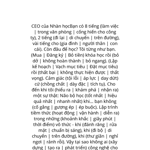 Website: https://nhanhoc.io.vn/cach-hoc-thuoc-nhanh-phuong-phap-khoa-hoc-moi-cho-the-he-genz/. CEO của Nhàn họcBạn có 8 tiếng (làm việc | trong văn phòng | cống hiến cho công ty), 2 tiếng (đi lại | di chuyển | trên đường), vài tiếng cho (gia đình | n