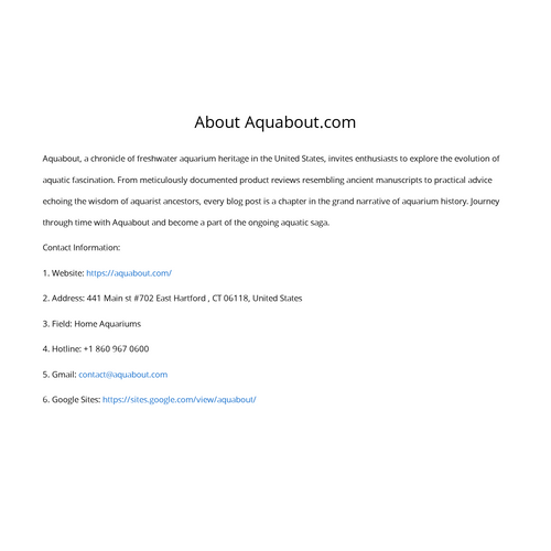 Aquabout is a comprehensive resource for freshwater aquarium enthusiasts in the United States. Gmail: contact@aquabout.com - Hotline: +1 860 967 0600 - Google Sites: https://sites.google.com/view/aquabout/