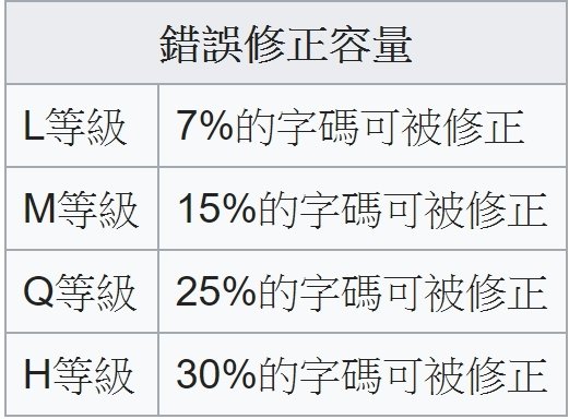 容錯率越高,QR code的圖形越大,因此常見的容錯率為15%