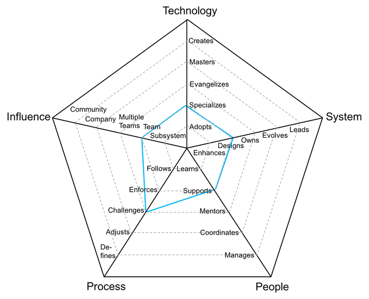 - Specializes: is the go-to person for one or more technologies and takes initiative to learn new ones