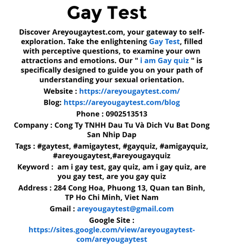 Website : https://areyougaytest.com/ Blog: https://areyougaytest.com/blog Phone : 0902513513 Company : Cong Ty TNHH Dau Tu Và Dich Vu Bat Dong San Nhip Dap Tags : #gaytest, #amigaytest, #gayquiz, #amigayquiz, #areyougaytest,#areyougayquiz Keyword :