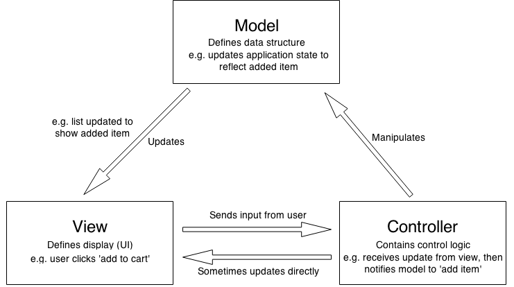 - it separates out the application logic into three separate parts, promoting modularity and ease of collaboration and reuse.