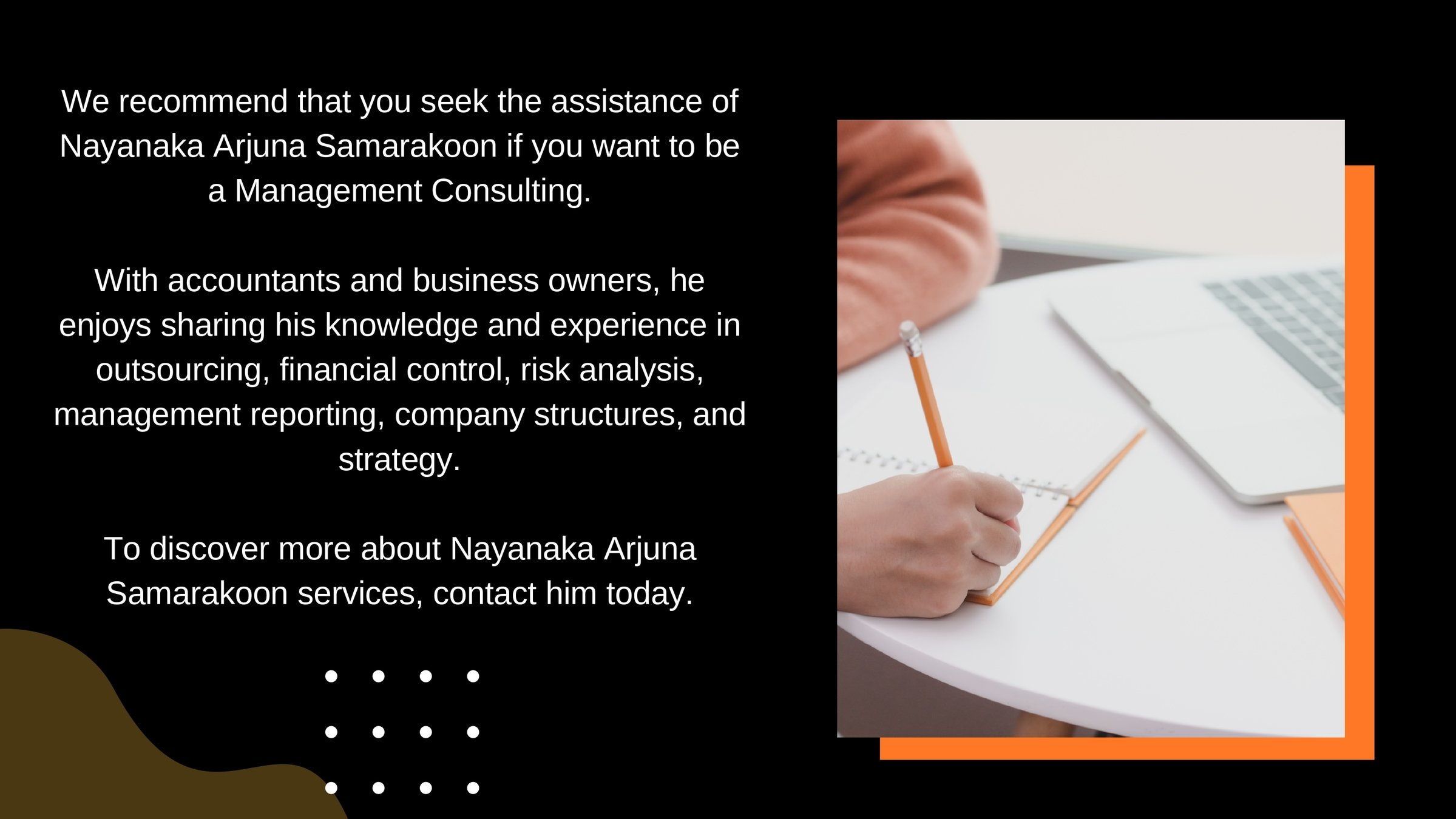 If you want to be a management consultant, we recommend that you seek Nayanaka Arjuna Samarakoon help.