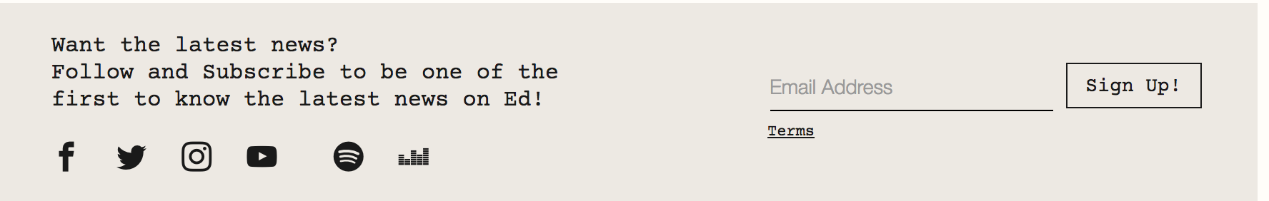 Underneath the video link is a subscription from for the users to follow the artist on various social media sites. It ask for the email address of the subscriber as well, and has terms and conditions for subscription.