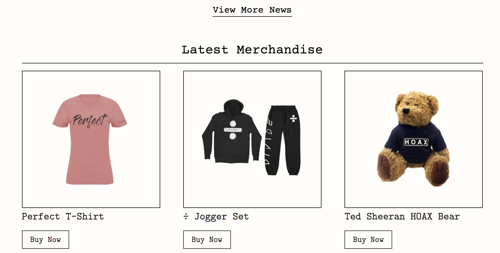 Then there is another link to the latest merchandise with images of different products related to the artist which are available for sale at the store.