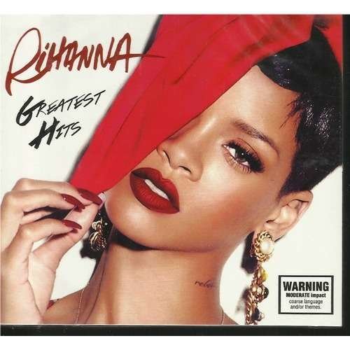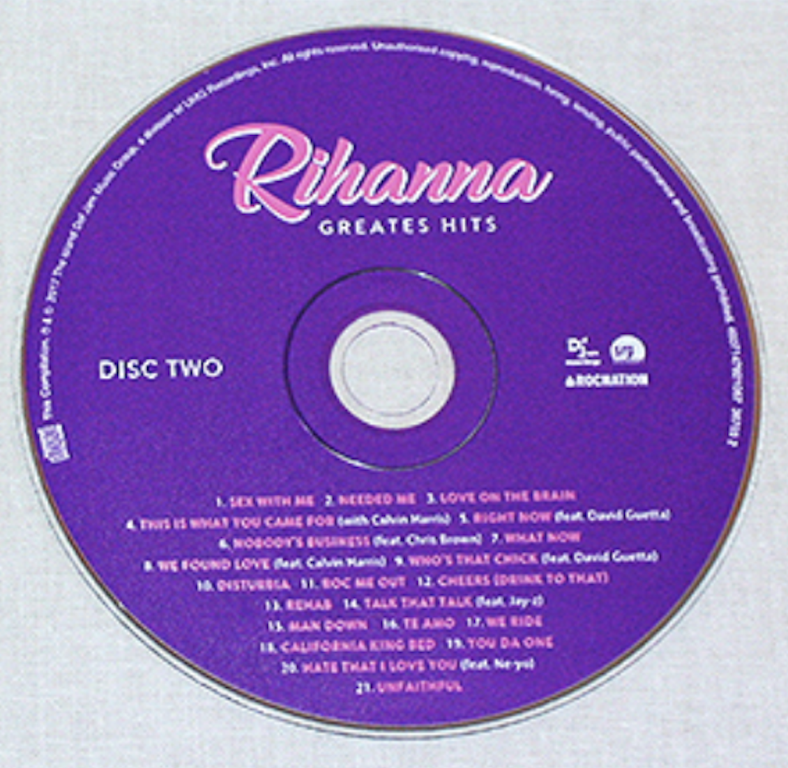The CD of Rihanna is in purple color. Rihanna is written in baby pink color with Italic fonts and white outlines around her name. This is the biggest font on CD below her name ' Creates Hits' is written in capital font, in white color. On left middle disk number has been mentioned on left side, record label company symboles has been inited. Around the CD record label credits have been placed, they are also in white color. Below at the bottom half of the CD the song name have been typed in baby pink color with the numbers in white. They are not Italic, however the feeding credits in front of some songs names have been mentioned in withe again. Italic font the color palette again gives girlish feel and it many suggest to audience it is for female audience.