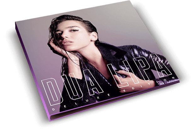 This album cover by Dua Lipa is one of the most simple. It has a back, elite and purple color is written in transparent color and capital font with white outline around her name. Deluxe editor is written below her name across the album cover. Her image is in center of the cover. Her image is in center of the cover. She is giving off very bold expressions as she is pulling at her jacket which is black in color white purple shine on it. We find it inspirational because of the color palette.