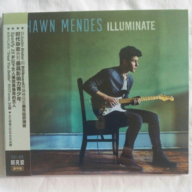 This album covers is by Shawn Mendes for Illuminate. It is different shades of blue and is very core of eyes. He is looking away in distance, holding a guitar, sitting on a chair. The guitar colors are in match with his white shirt and brown floor boards. Shawn Mendes name is written in capital big font, it is blue too and album name matches with the color palette too. We found this album cover inspirational because it gives off vey mysterious feel as if he is far away in his feels. The aura around him is very peaceful and blue color connotes water.