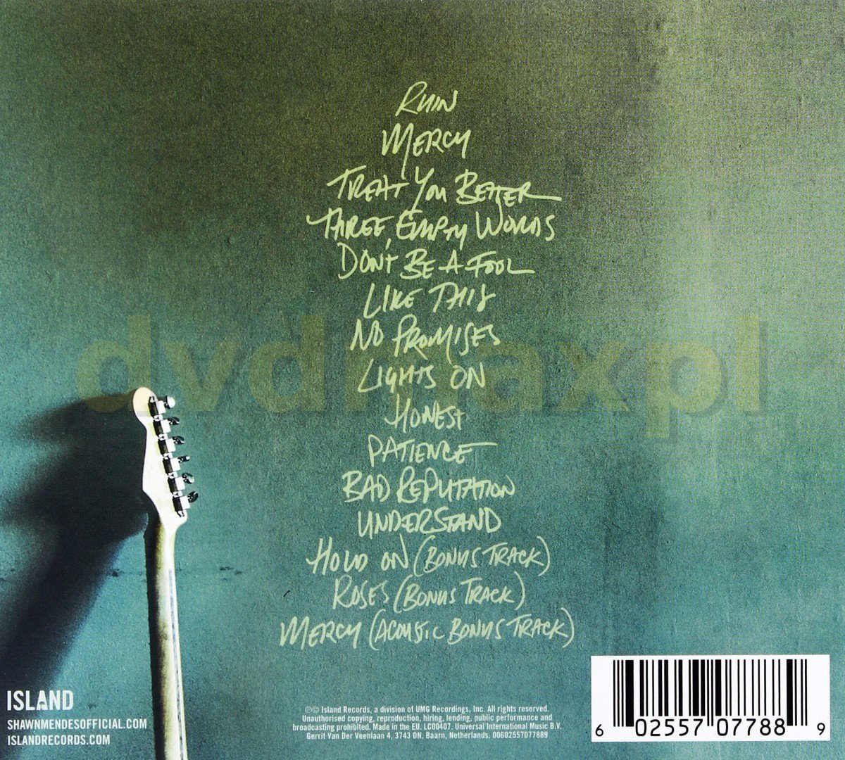 The back cover of the Illuminate by Shawn Mendes is again a color palette of shades of blue, mustard and white. It again gives off peaceful vibes like the cover page. Song names are in light yellow Italic font and are aligned in center. On bottom record label company's information is given.On right side bar code is placed, an image of half of Shawn's guitar is added too.