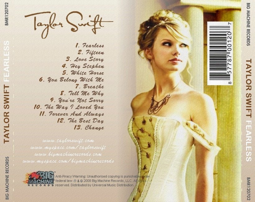 This back cover is from Taylor swift's album Fearless. It is very unique back cover. It seems to be divided into two shades of pinks and light yellow. Taylor's image is on the right side in a yellow glow. She is looking of towards her left. Her hair, color, dress color and skin tone are matching, yellow glow. She does not look seductive here but as if she is looking at distance and is in some thought and she looks innocent as well. Barcode is placed on top right side while record label company's name, BNR her name and album edges left and right. On left half shade of skin pink her name has been written in a maroons brown shade and Italic font, very girlish . it center the song names and numbers are written in same font.