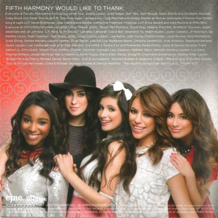 Fifth Harmony Better Together. This inlay text is on the right side with the tank you not to the helpers, who made their album a success along with their image. The thank you note is in white color against a very colorful bright background reddish and grayish. The girls are dressed in glittery. They are wearing formal part wear dresses. They are looking at camera and looking happy too. At the bottom the record label company name is given and copy right have been placed. We liked this inlay because we liked the idea of giving medics to helpers as well the evilness of the inlay.