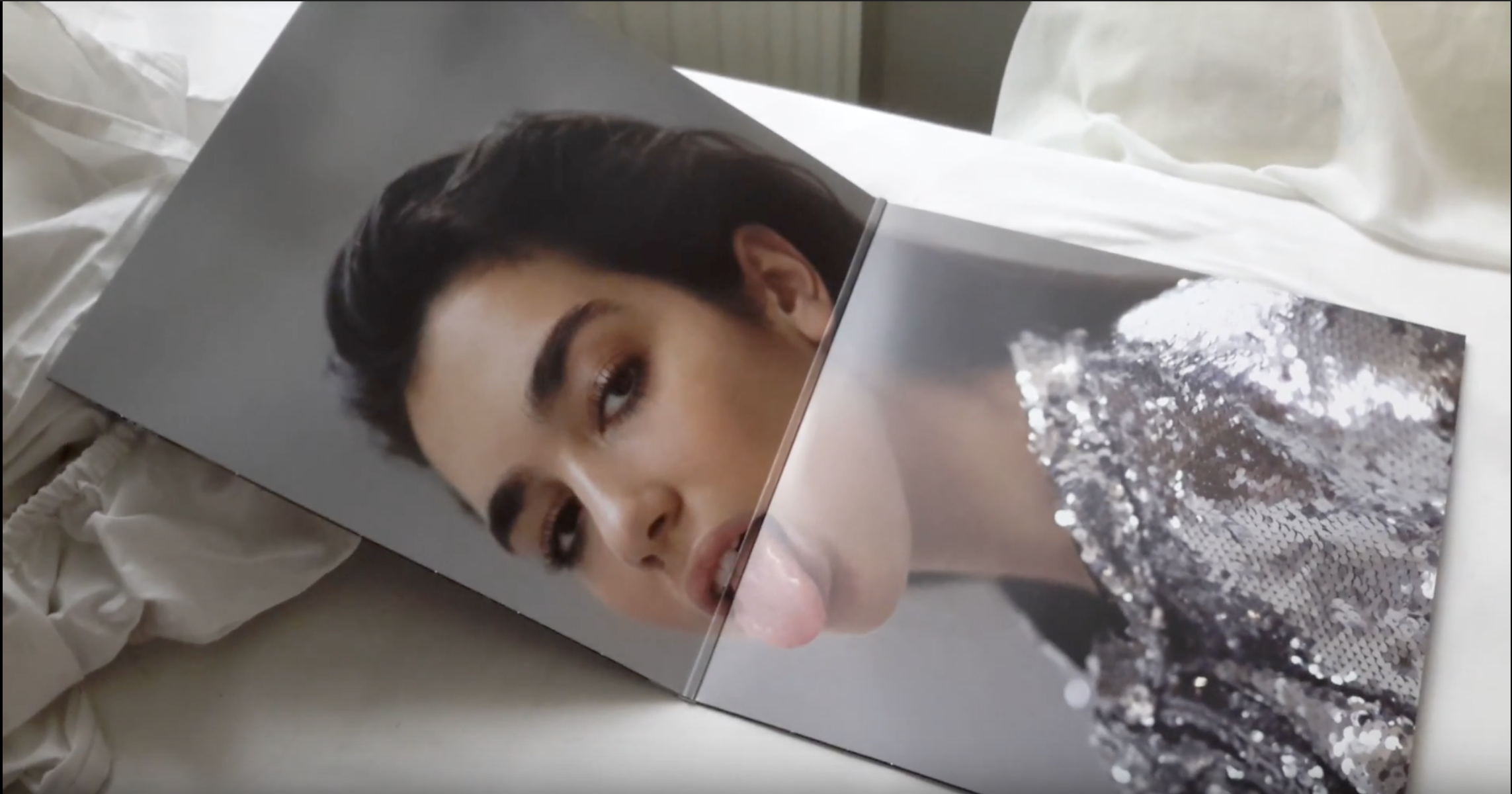 This inlay is form Dua Lipa's albuM. It is a simple picture of her against gray background wearing a glittery grayish shirt. Her hair are tied. She looks very ate like a little brat as she is packing out her tongue. She is also wearing little makeup. Although this is very girly, But we like the simplicity of inlay. Such as image of artist brings them close to audience.