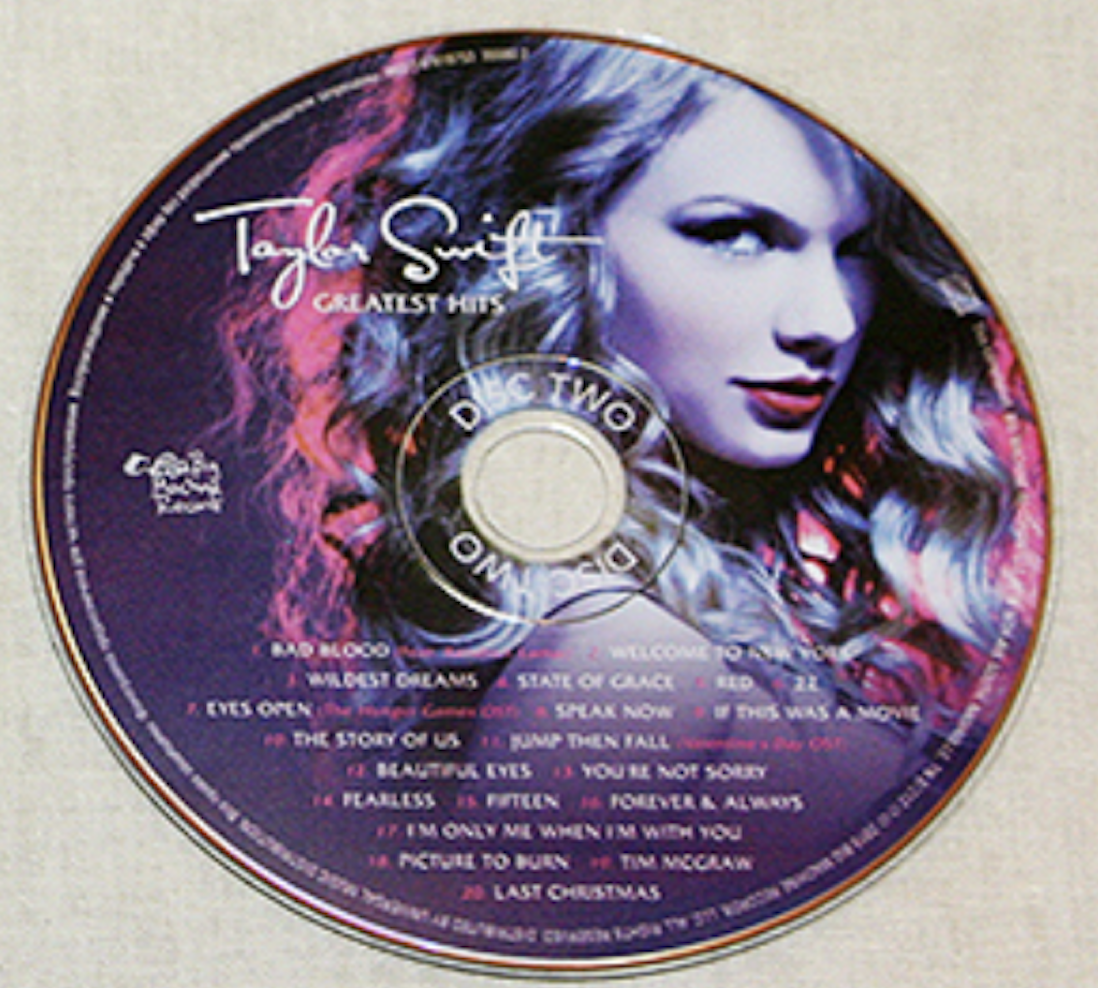 This CD by Taylor Swift complexly designed, this is what it's look like because her name is very brilliantly captured. The lighting reflecting on her hair is bright pink color on the left side while other Remaining of her hair are giving light publish color. This time she is not wearing her trade mark red lipstick but bright pink one. The CD is purple and pink color palette with all the font white in color except the numbers of the album name and fearuring credits in front. These are in shocking pink color. Around the record label credits have been mentioned in white font too. Tylor's name have been put in Italic font in white color. Tylor's name is very seductive she us boldly making contact with the camera and a mysterious bold look like always. The ciolor palette is in girlish colors. However the whole CD does give audience feel that it is for female due to her seductive looks.