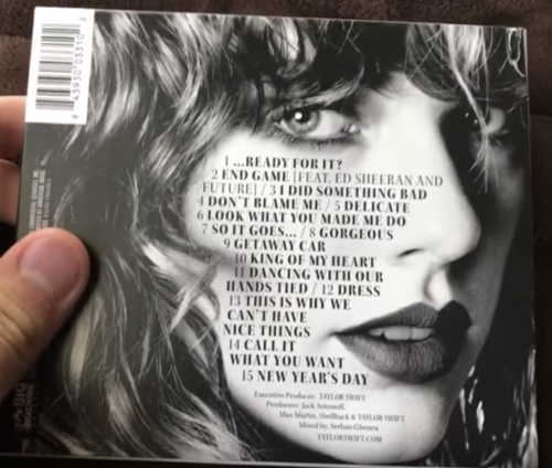 The CD as well follows the black, white and grey color palette like a newspaper does. There is writing in white small fonts around the whole CD at edges. CD does not contain Taylor’s whole picture but close ups of her eyes, nose, lips, fingers.(This adds to her mysterious aura for audience.