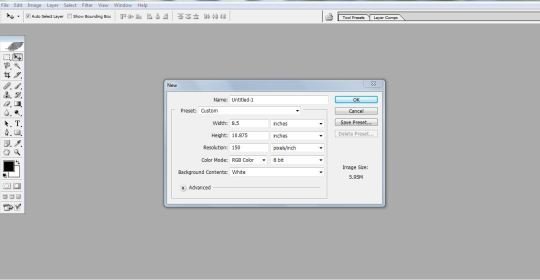 I opened a new file in Adobe Photoshop and used the costume setting for my new file; with page width and height your an A4 size and a resolution of 150ppi. The color mode was RGB at 8 bit.