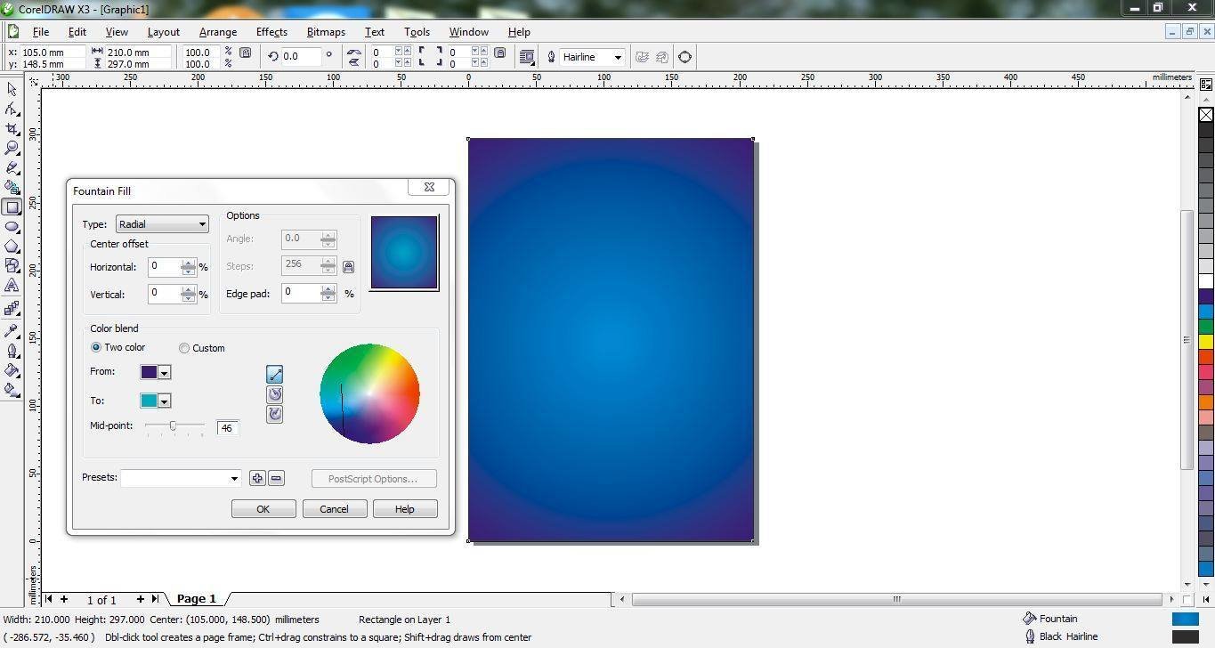 After that I opened a new page with the dimensions required fro the cover page of the magazine and chose a color for the background. Using a color for the background. Using the Fountain fill dialogue box, I applied a radial fill type to give it a glowing look.