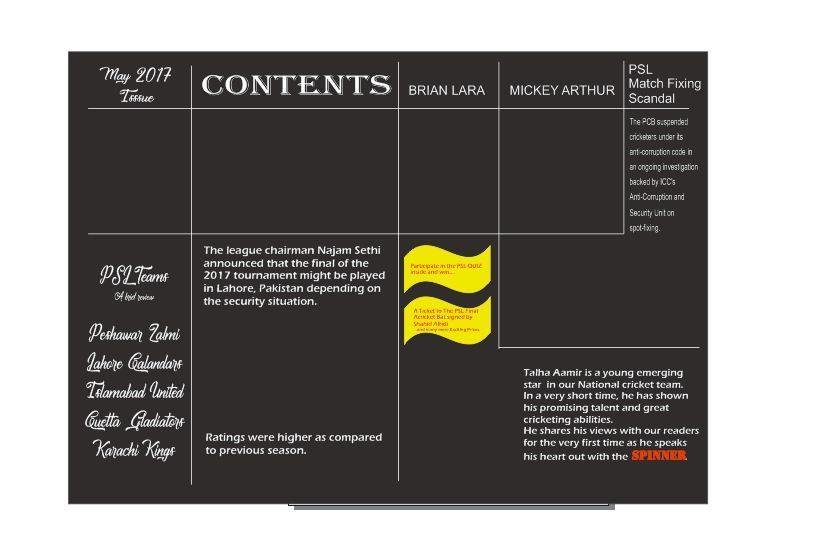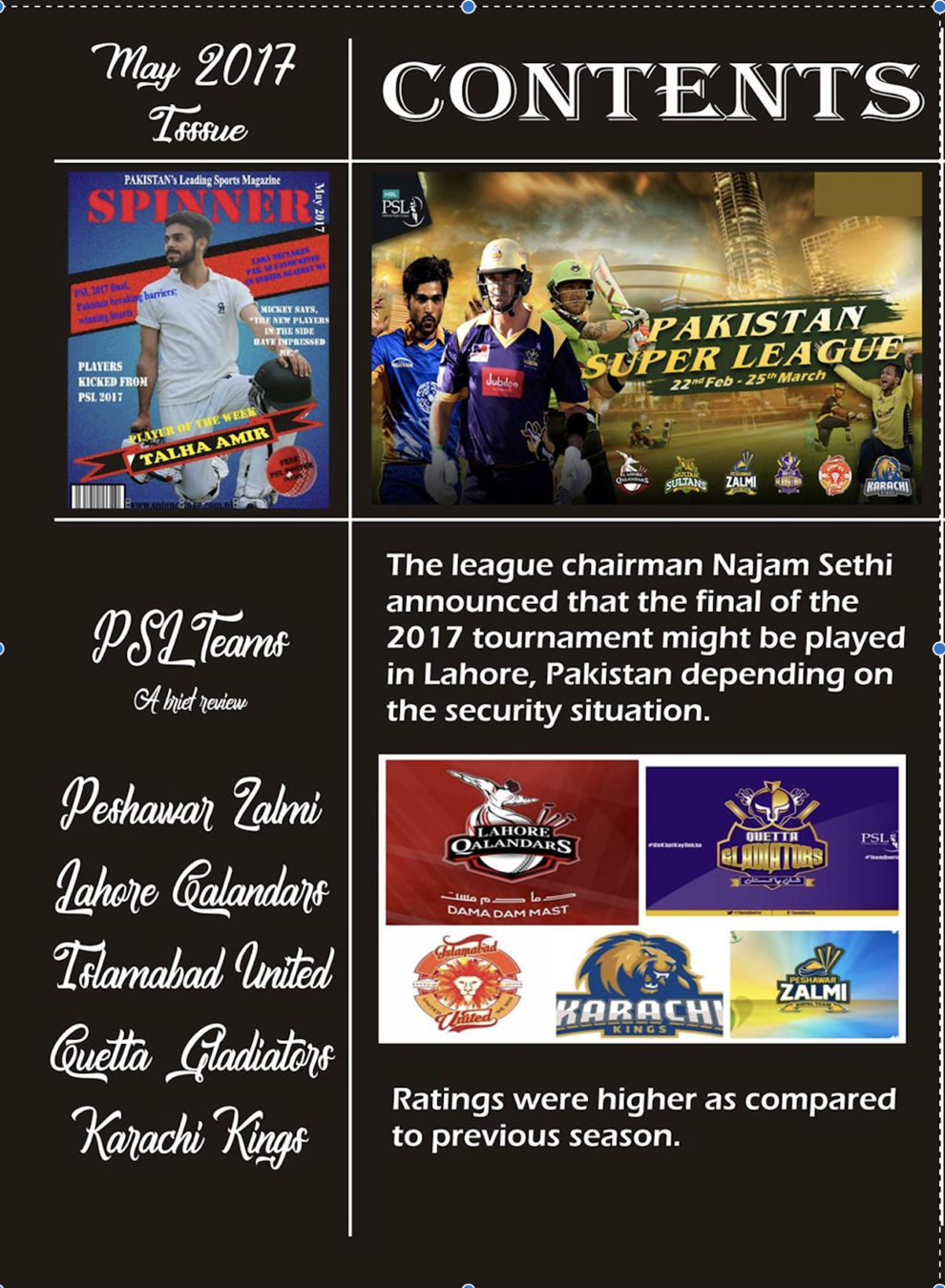 This is half of my content page left side I though of adding my cover page in it so I placed it under the may 2017 Issue title and underneath is the PSL teams names righten and I have mention this and future related to PSL i put some pictures ok Pakistan Super league picture with a little bit information and team logos