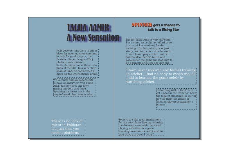 After that I added the text part of the spread sheet. I used the text tool and dragged it to draw text boxes to contain the text. I placed these text boxes to place the text. I placed these text boxes randomly on both halves sides of the spread sheet. I highlighted a couple of statements by giving them a different color and changing the orientation and dimension of the text boxes.