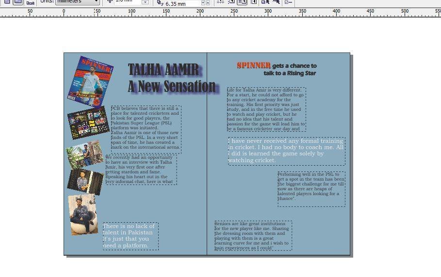 To begin the spread sheet for my magazine, I again used the coral draw. I started with drawing a rectangle tool. Since I wanted my spreadsheet to be on two pages, so I drew a rectangle with double the width of an A4 sheet-i-e 420mmx297mm. Then i filled it with a light blue color and drew a vertical lines using the bezier tool, in the middle to show the two pages.