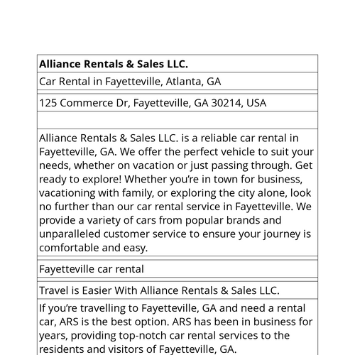 Alliance Rentals & Sales LLC. is a reliable car rental in Fayetteville, GA. We offer the perfect vehicle to suit your needs, whether on vacation or just passing through.