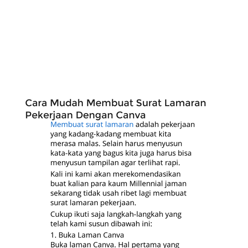 Membuat surat lamaran adalah pekerjaan yang kadang-kadang membuat kita merasa malas. Selain harus menyusun kata-kata yang bagus kita juga harus bisa menyusun tampilan agar terlihat rapi. Kali ini kami akan merekomendasikan buat kalian para kaum Millennial jaman sekarang tidak usah ribet lagi membuat surat lamaran pekerjaan. Cukup ikuti saja langkah-langkah yang telah kami susun dibawah ini: 1. Buka Laman Canva Buka laman Canva. Hal pertama yang harus kalian lakukan adalah membuka laman canva dari browser atau buka dari handphone juga bisa tapi harus install aplikasinya lewat PlayStrore. Kali ini kami rekomendasikan melalui browser karena lebih mudah untuk melakukan pengeditan. 2. Memilih Template Memilih Template. Setelah kalian masuk ke laman Canva kalian bisa langsung menuju “All Templates” lalu pilih “Resume”. Ada banyak template yang telah disediakan untuk dibuatkan surat lamaran pekerjaan. Silahkan pilih sesuai dengan selera kalian. 3. Melakukan Pengeditan Melakukan pengeditan. Setelah berhasil memilih template yang sesuai, kalian bisa lanjutkan dengan melakukan pengeditan surat lamaran pekerjaan dengan Canva. - Kalian bisa masukan foto profil kalian. Dengan cara upload pada menu pilihan sebelah kanan, lalu pilih “Upload Files”. Kalian bisa mengganti foto yang ada pada template dengan foto kalian. - Merubah dengan Nama kalian - Merubah Informasi Kontak - Merubah Pendidikan - Merubah Keahlian - Merubah Kalimat Objectif Karir (Suatu kalimat dimana kamu menyebutkan tujuan yang ingin kamu capai saat melamar pekerjaan tersebut) - Merubah Pengalaman Kerja 4. Melakukan Penyimpanan Melakukan penyimpanan. Setelah selesai melakukan tiga tahap diatas kalian bisa melakukan penyimpanan hasil surat lamaran pekerjaan yang teah kalian buat tadi. Bisa disimpan dalam format JPG,PDF atau PNG sesuai keperluan kalian. Kesimpulan: Tips ini membantu kalian untuk membuat surat lamaran pekerjaan dengan mudah. Jangan lupa kasih komentar di bawah ya, semoga membantu! contoh artikel membuat lamaran dengan canva