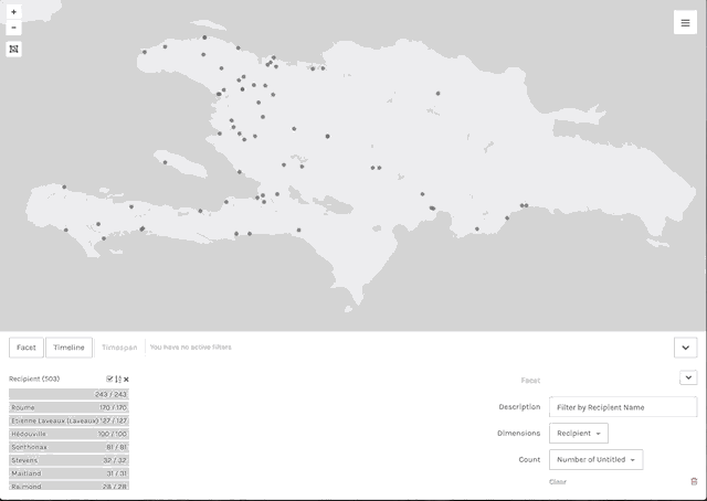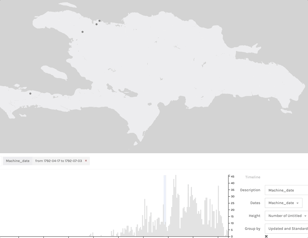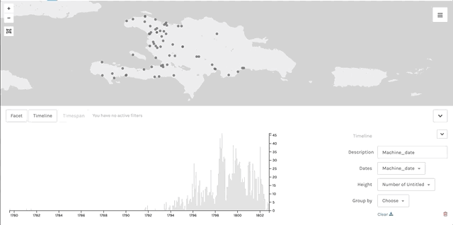 It shows the entire network of Louverture and his recipients. To make this more readable and usable we can create a facet using the "machine_date" field.