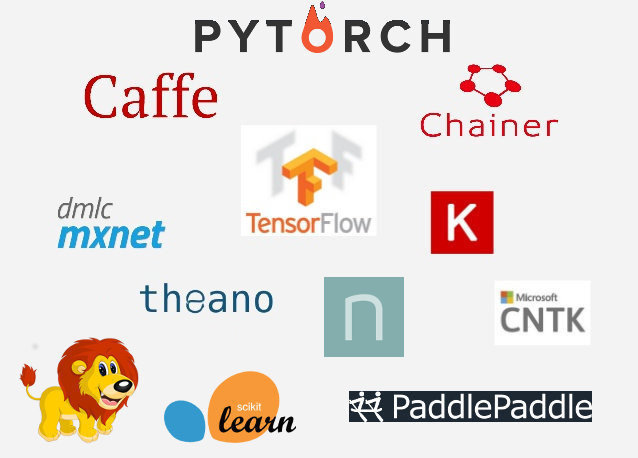 Apache Singa, Brainstorm, Caffe, Chainer, CNTK, Keras, Lasagne, mxnet, Neon, Paddle, PyTorch, TensorFlow, Theano, Veles
