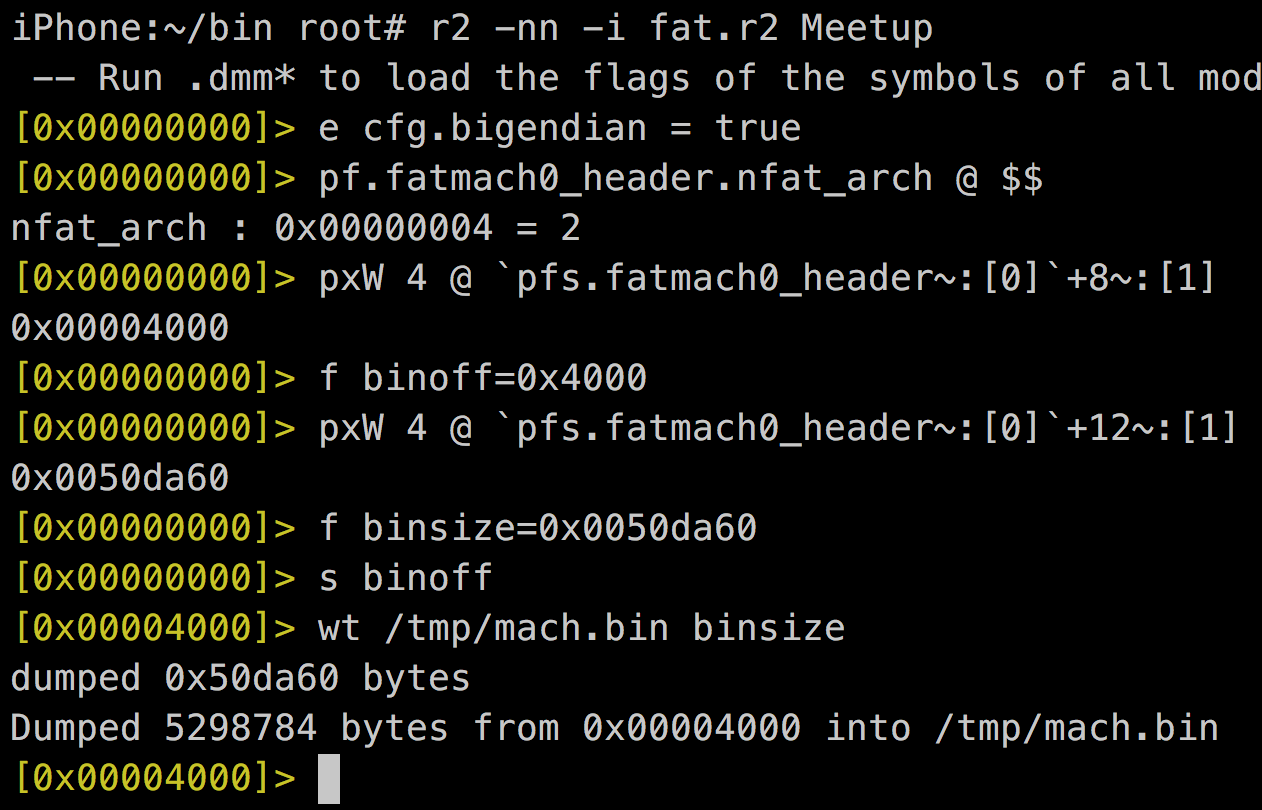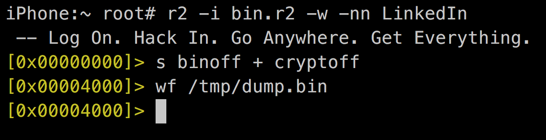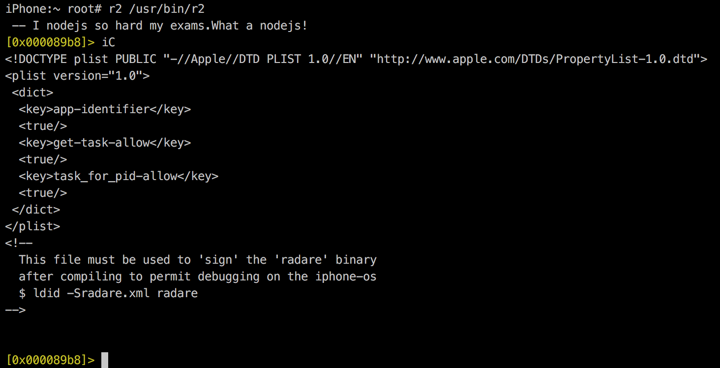 iPhone:~ root# ldid -Sradare.xml /usr/bin/radare2R2 in your iPhone