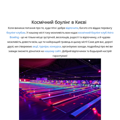 https://astro-bowling.com/ Коли виникає питання про те, куди піти і добре відпочити, багато хто віддає перевагу боулінг-клубам. У нашому місті таку можливість вам надає космічний боулінг-клуб Astro Bowling - це не тільки місце зустрічей, веселощів, р