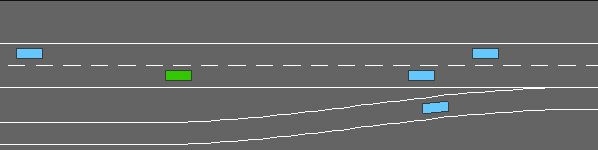 В этой задаче транспортное средство трогается с главной автомагистрали, но вскоре приближается к транспортной развязке с приближающимися транспортными средствами на съезде. Цель агента - поддерживать высокую скорость, освобождая место для транспортных средств, чтобы они могли безопасно слиться с потоком.