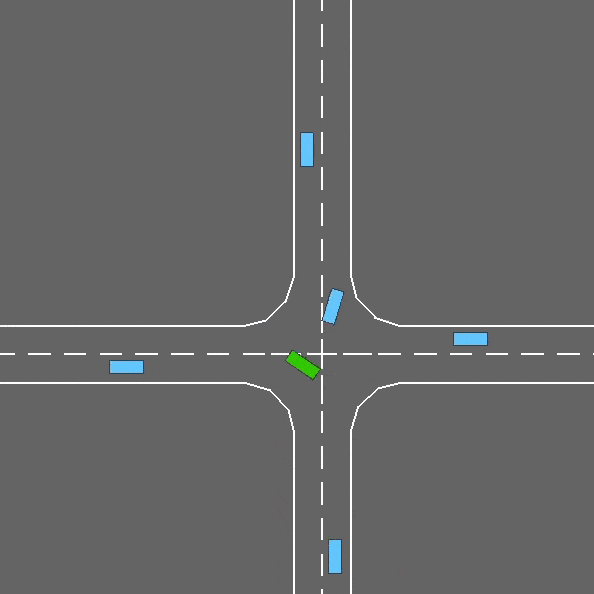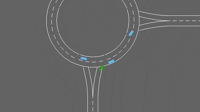 В этой задаче транспортное средство приближается к кольцевой развязке с другими движущимися транспортными средствами. Он будет следовать своему запланированному маршруту, но должен обрабатывать смену полосы движения, чтобы как можно быстрее объехать круговую развязку, избегая столкновений.