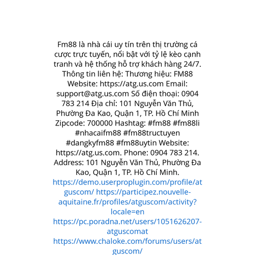 Website: https://atg.us.com. Fm88 là nhà cái uy tín trên thị trường cá cược trực tuyến, nổi bật với tỷ lệ kèo cạnh tranh và hệ thống hỗ trợ khách hàng 24/7. Thông tin liên hệ: Thương hiệu: FM88 Website: https://atg.us.com Email: support@atg.us.com