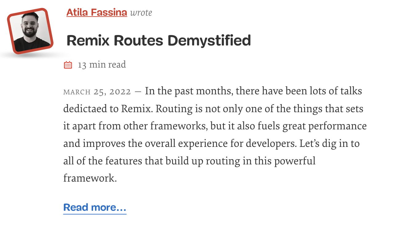 Remix is a framework revitalises web development by putting progressive enhancement in the front seat. It creates solutions that approximates developers to the platform. It uses Developer Experience as means to enforce web best practices and with that brought the term Optimistic UI back to our daily lives. Let's have a look at what features the Remix offers out-of-the-box to get developers creating high-quality web apps easily and deploying them anywhere that can run JavaScript.