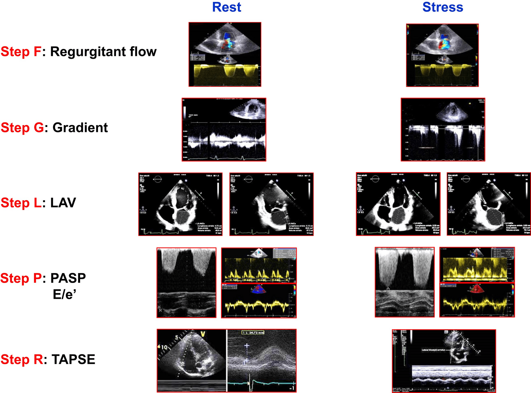 ABCDE + F (regurgitant flow) G (LVOT gradients) L (left atrial volume/function) P ( pulmonary and LV pressures) L (RV function)