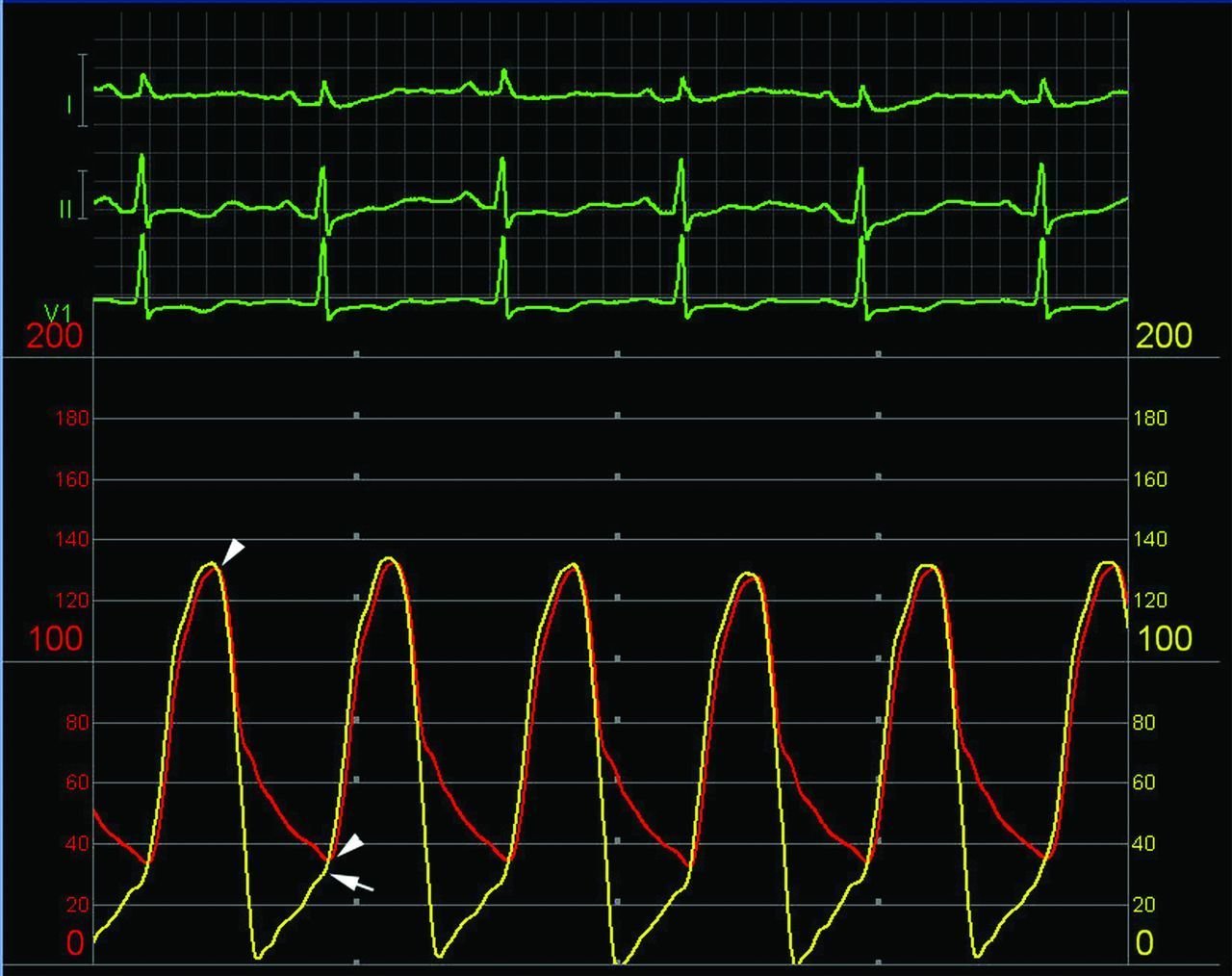 1+ Small amount of contrast in the left ventricle during diastole that clears with each beat and never completely fills the left-ventricular chamber