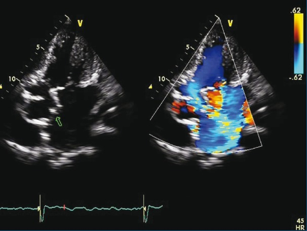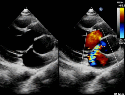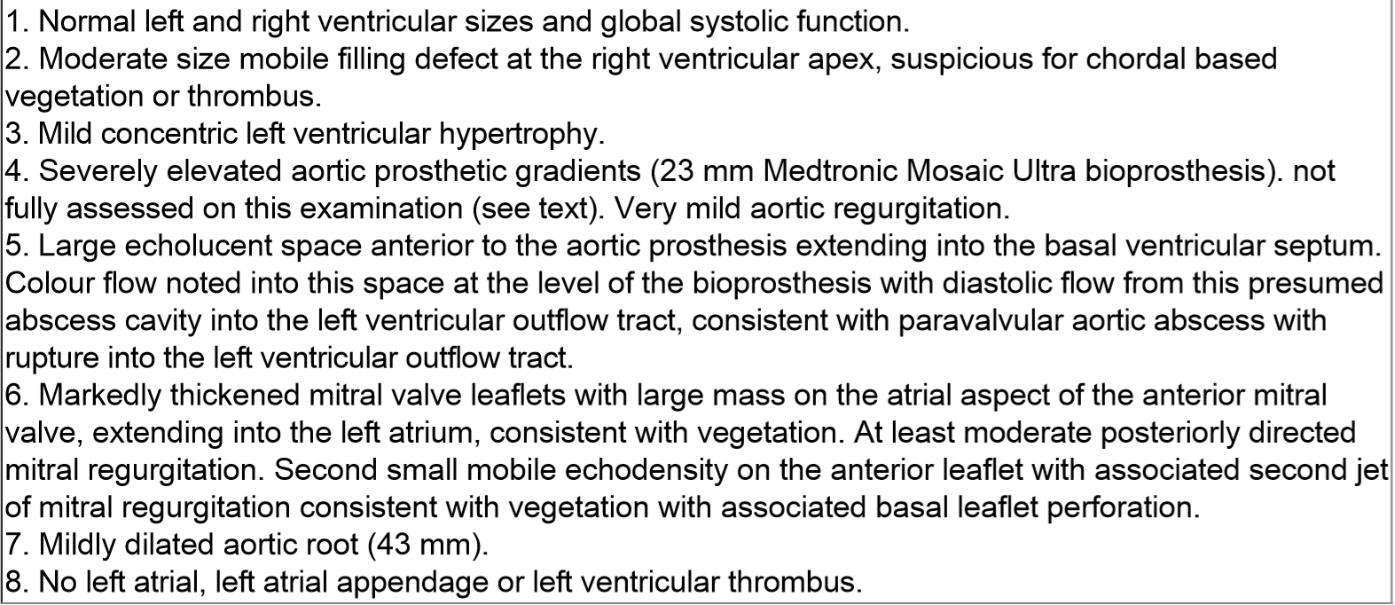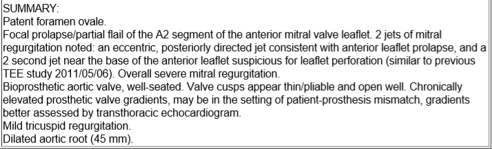 4. Palliative, complex mitral repair (A2 triangular resection, debridement of posterior medial commissure, A1 perforation closure and 34 mm Cosgrove band annuloplasty).