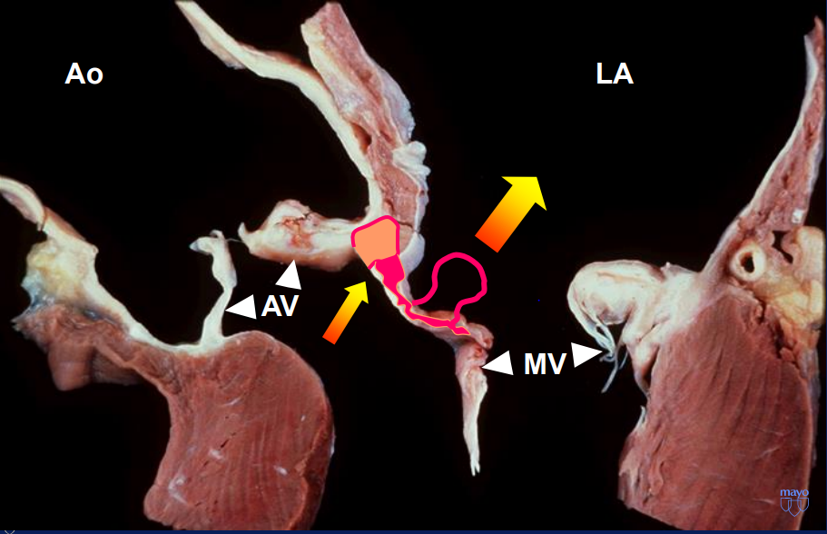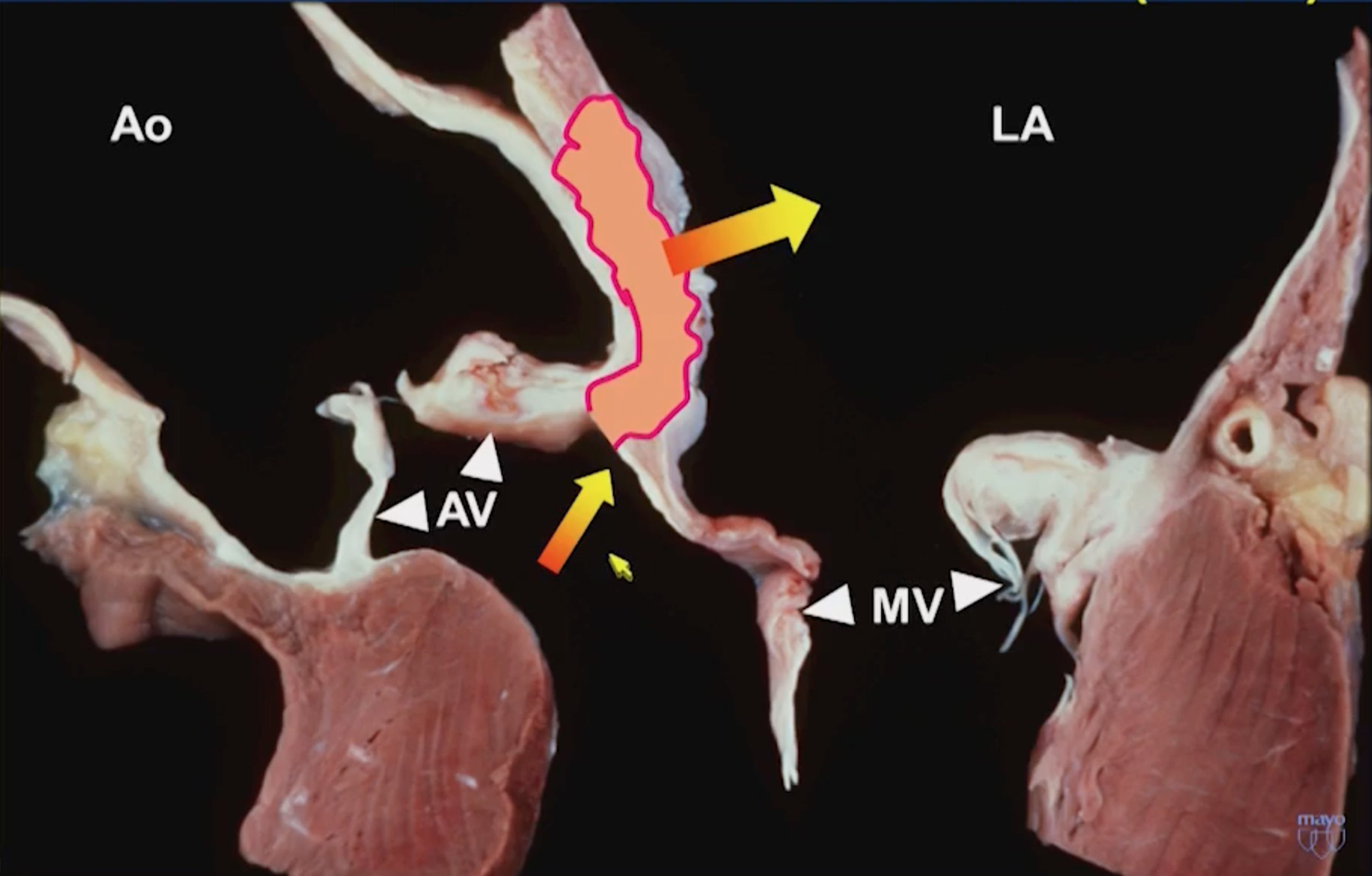 Fibrous region of the heart that connects the anterior mitral leaflet to the posterior aortic root and communicates with the left ventricular outflow tract