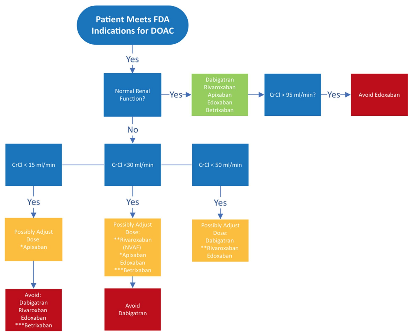 Severe or end-stage renal disease (ESRD) not requiring dialysis: Apixaban or warfarin is considered appropriate (AHA/ACC/HRS [January 2014]; AHA/ACC/HRS [January 2019]). Some experts recommend apixaban 2.5 mg twice daily for CrCl 15 to 29 mL/minute (ACCP [Lip 2018]).