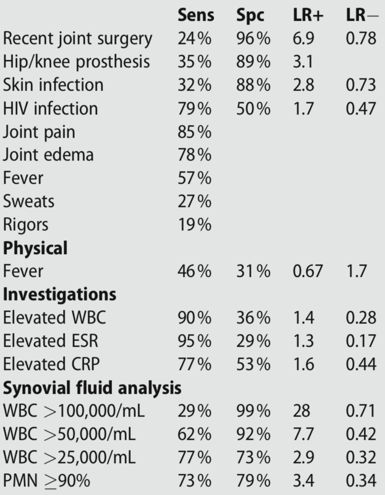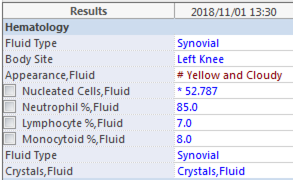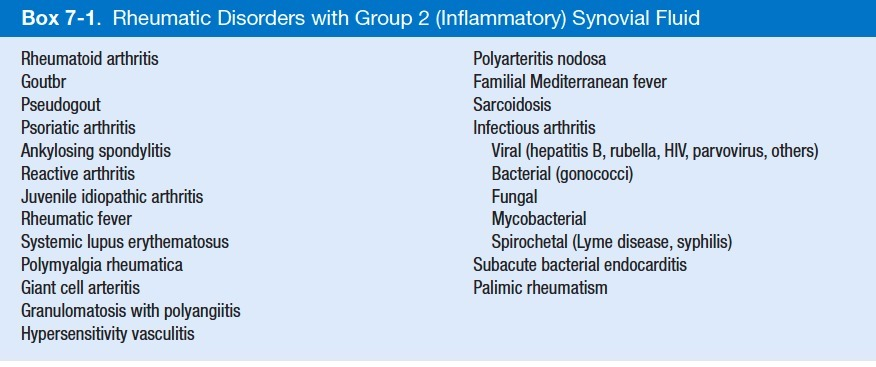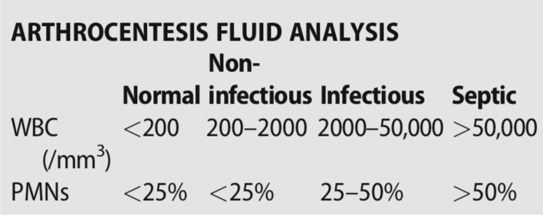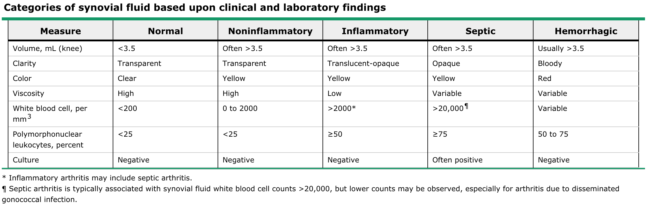 Synovial fluid is usually purulent, with typical leukocyte count of 50,000 to 150,000 cells/mm3 (most of which are neutrophils)