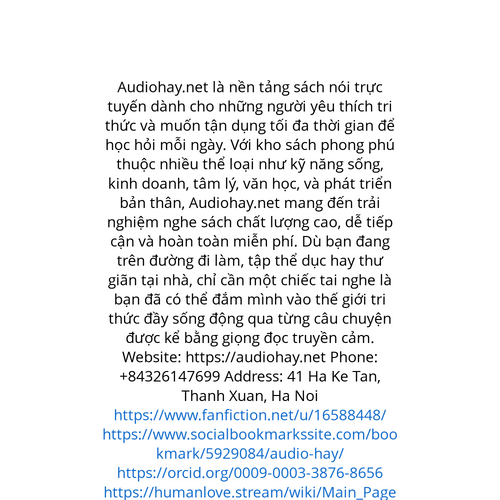 Website: https://audiohay.net Audiohay.net là nền tảng sách nói trực tuyến dành cho những người yêu thích tri thức và muốn tận dụng tối đa thời gian để học hỏi mỗi ngày. Với kho sách phong phú thuộc nhiều thể loại như kỹ năng sống, kinh doanh, tâm lý