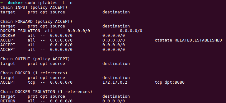 A configuração padrão o Docker utiliza a interface bridge para concentrar todas as comunicações. Além disso, ele providência as regras de firewall no iptables para prover as rotas de tráfego.