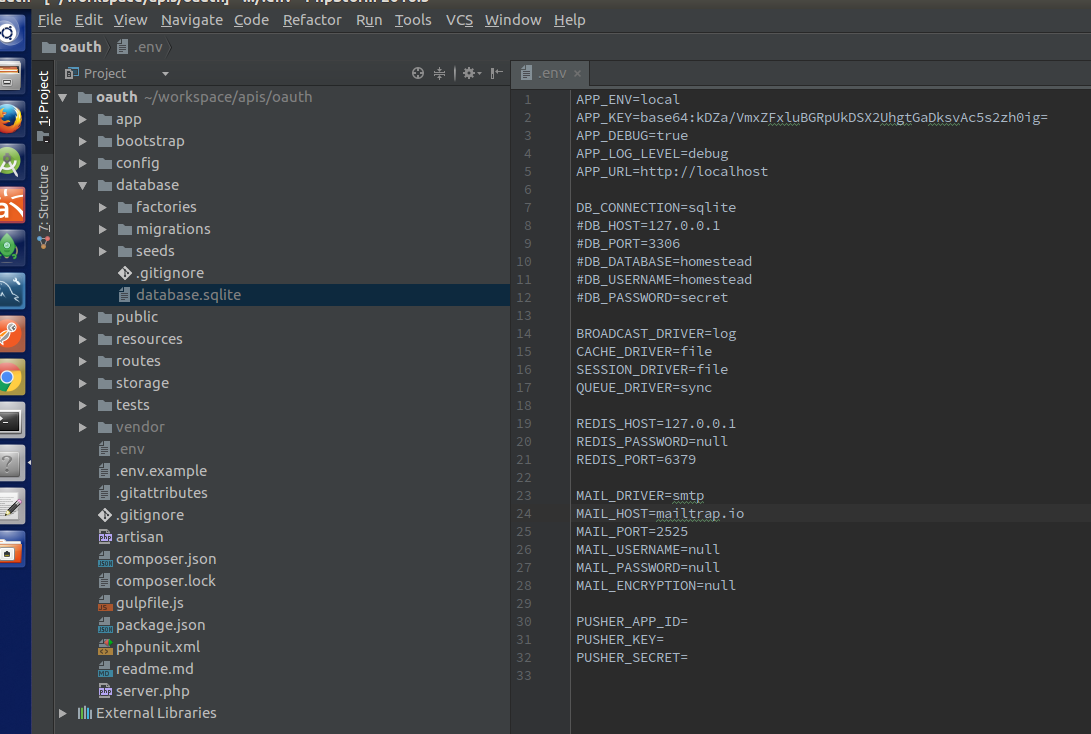 Utilizaremos o sqlite para o exemplo ser bem simples, deixe seu arquivo .env igual o da imagem e crie na pasta database/ um arquivo database.sqlite.