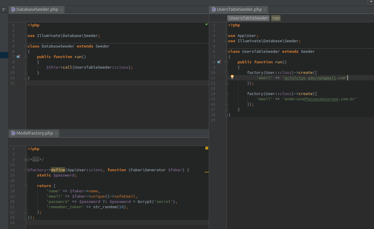 Configurando a seeder para criar dois usuários e adicionar sua chamada no DatabaseSeeder.php.