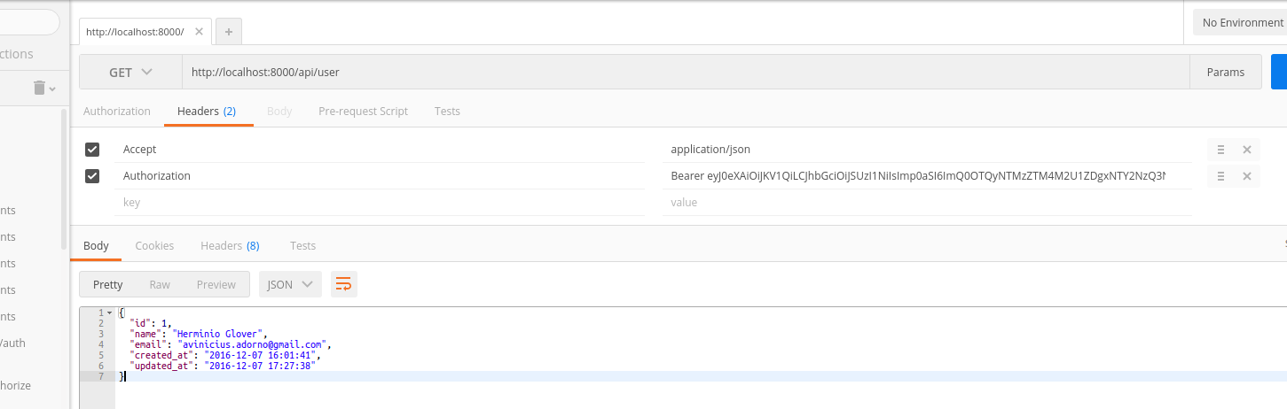 Acessando uma rota de API no nosso server que está o passport instalado. Lembrando que podemos ter APIs fora desse server de autenticação, esse exemplo usamos um endpoint dentro do mesmo server do OAuth2 para testar se ele está validado os tokens.