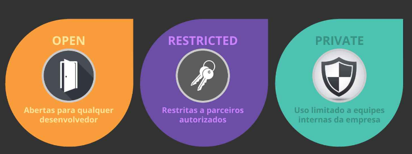 Nos dias de hoje que tudo é uma API, temos APIs conversando com outras, clientes ou aplicações consumindo serviços de nossas APIs, temos três tipos a Open, Restrict e Private.